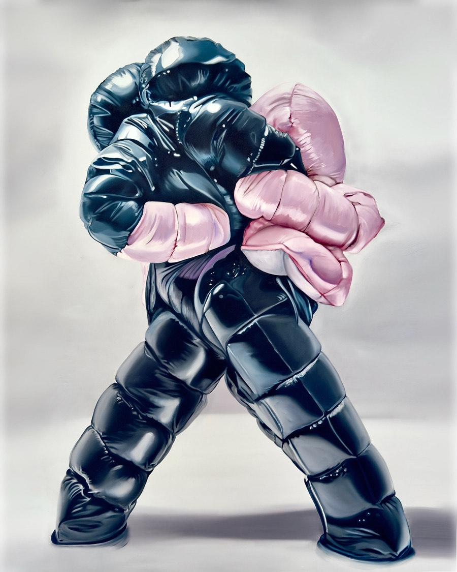 CS: The imagery of puffer jackets in Virtually Yours grew out of a deeply personal experience: visiting my partner on what would become his death bed in the ICU, where every attempt at contact was mediated through protective layers of latex gloves and glossy clothing. Those barriers made touch at once tender and distant, and I began to see the padded surface as a kind of interface — protective yet suffocating, intimate yet estranging.