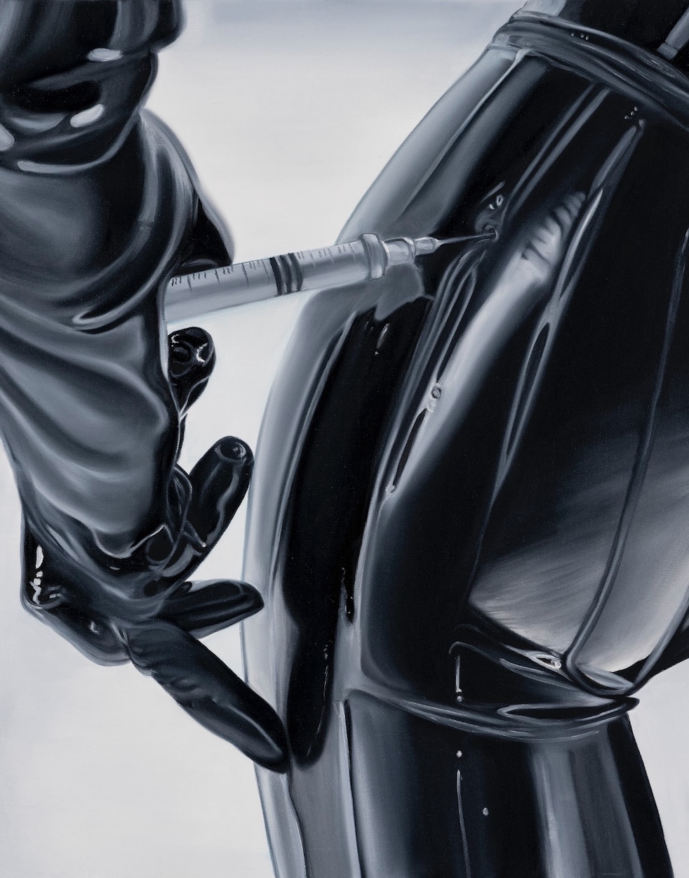 CS: Yes and No. In Berlin the puffer jacket is what the baseball cap is in America: a uniform, not a fetish. Everyone wears those big black glossy coats through the endless winters. Straps, latex, vinyl belong to the city too, but what stayed with me was the sheen itself, that glossy black that always recalls the surface of the iPhone — cold, omnipresent, the portal through which so much of life now passes.
