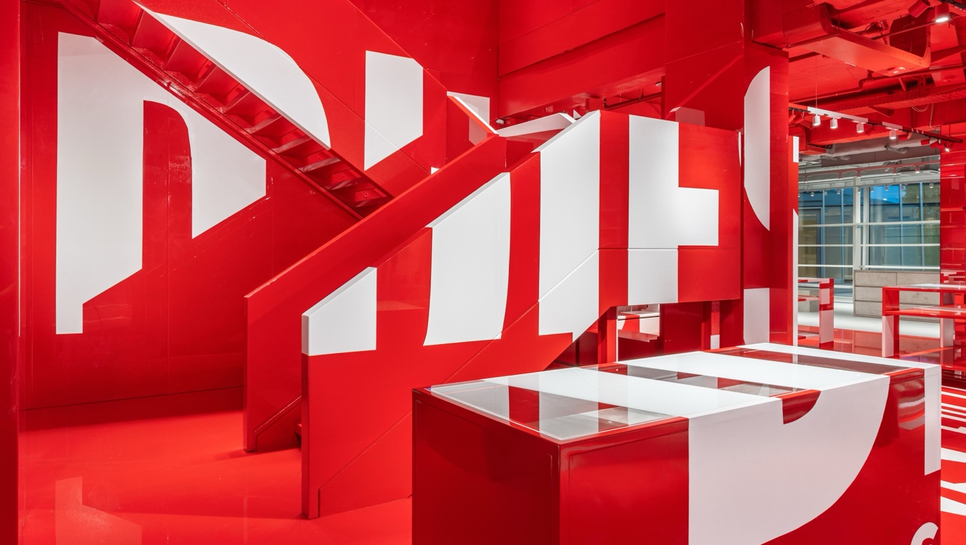 Built entirely from exposed concrete, the interior captures Berlin’s urban essence with raw textures and sharp lines. At its heart lies a deep red denim area inspired by the Biscotto logo, merging art, illusion, and brand identity.