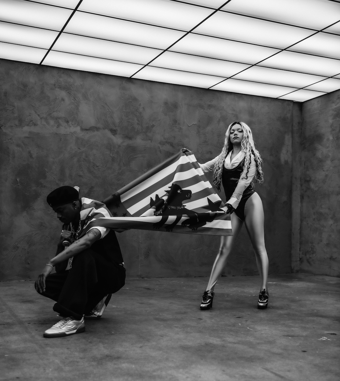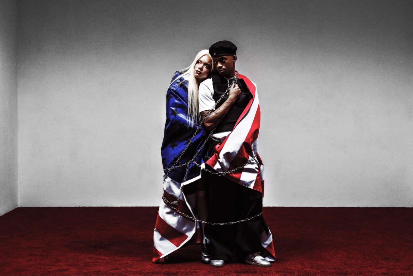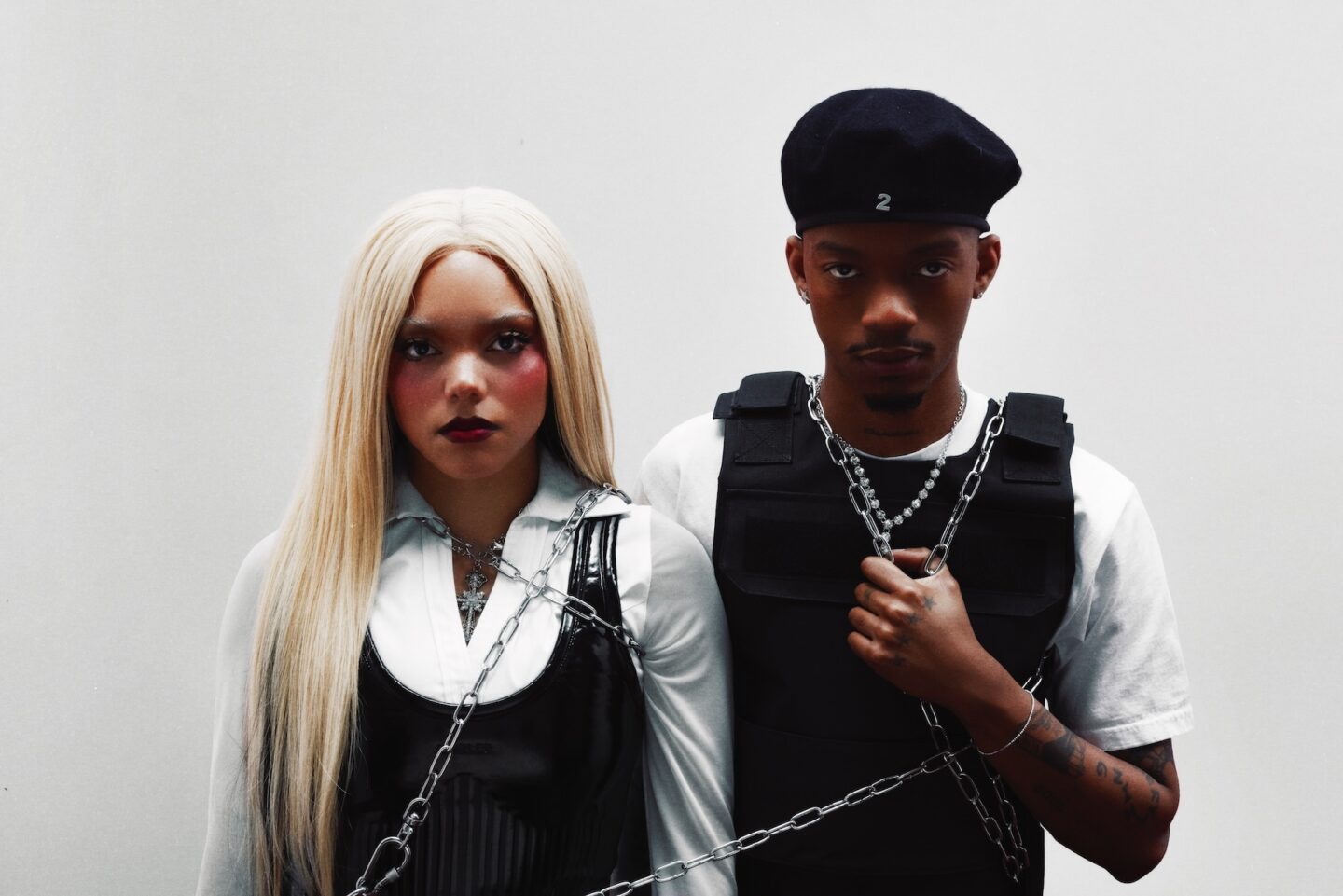 PARTYOF2, the Los Angeles-based hip-hop duo consisting of Jadagrace Michiko Gordy-Nash and Tyson Coy Stewart known as SWIM, are releasing their newest album AMERIKA’S NEXT TOP PARTY! on October 17, 2025. In a relaxed and friendly conversation with Numéro Berlin, the two well-dressed young musicians sit casually on a sofa, radiating confidence and enthusiasm as they talk about how their music has evolved since continuing as a duo, their collaborative songwriting and production process, the mix of political commentary and danceable music, the spiritual side of creating music, and how their acting experience inspires their innovative music videos.
