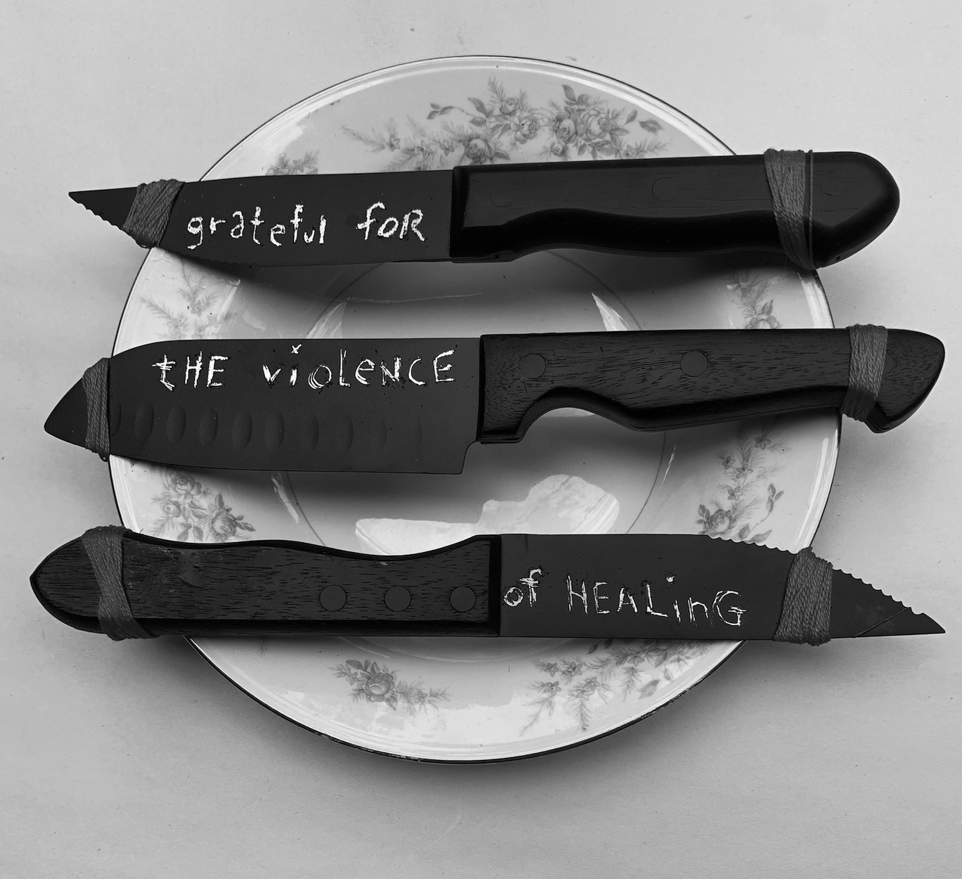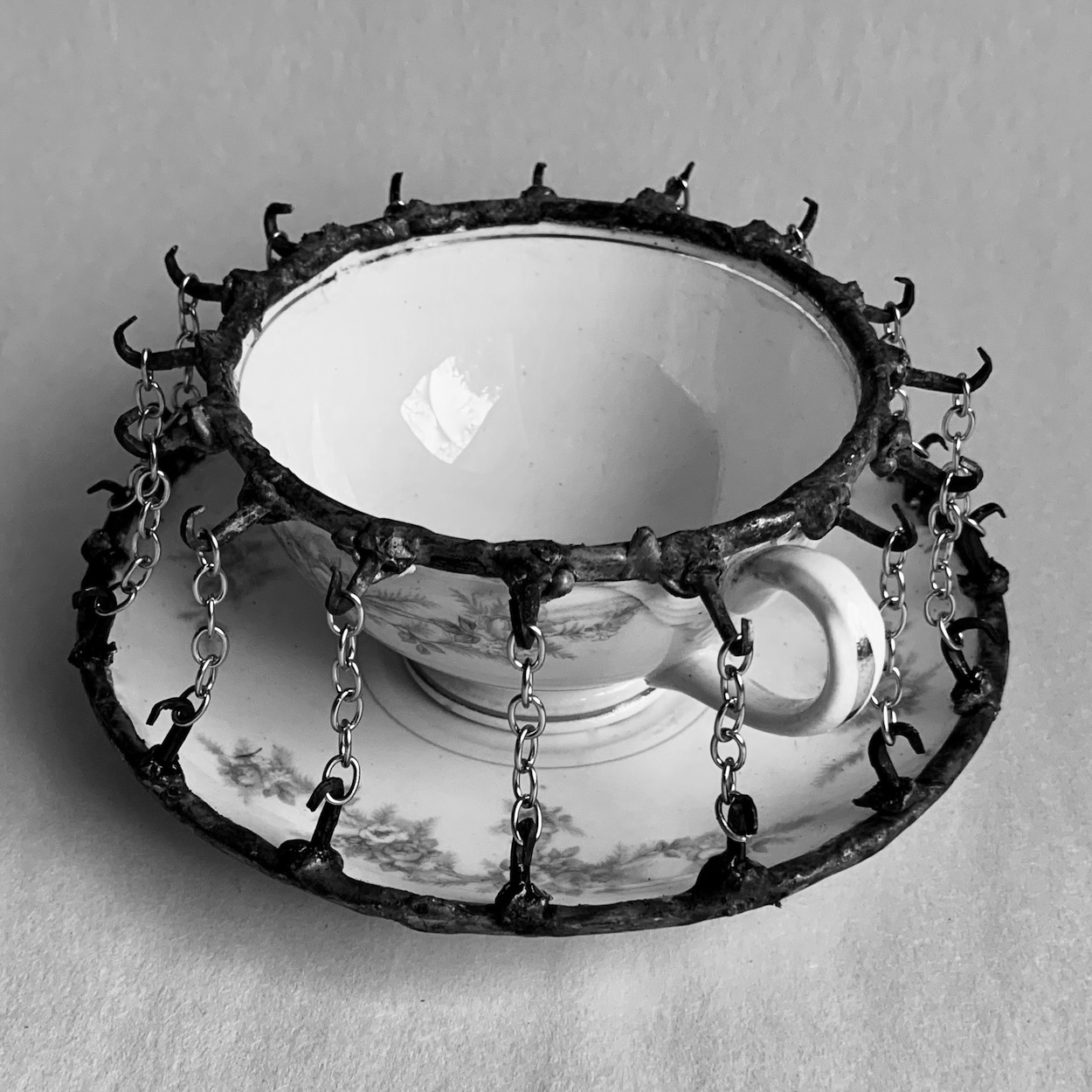 A rusted barbed wire holds a frail piece of porcelain. Worn-out cutlery guards freshly cut edges. We feel a kinship with a toothed tea cup. Glen Martin Taylor’s reimagined tableware hands a bare human heart to the hungry spectators. The kintsugi-inspired, cute-meets cruel artworks call out to our god-shaped holes. At the bottom of them, there’s Glen, transmuting pain. We got the timing mixed up, so I arrived at the digital space of our interview an hour late, apologetic. Glen doesn’t mind: “Waiting is good with me. I’m always creative when I’m waiting.” As in play, the minutes pass but time stops for us as we toss about bits of the sacred and the profane, talk about the art of love and baking bread.