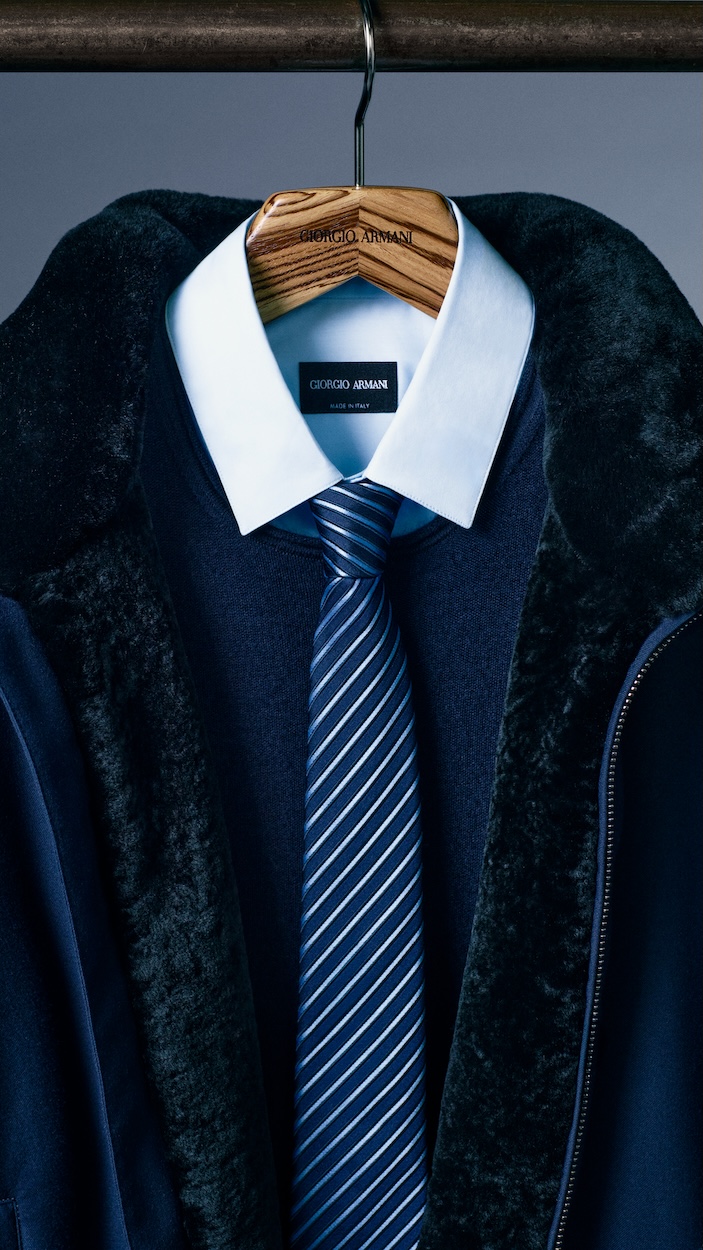 Made from fine materials in navy black and chocolate the collection includes jackets coats blazers knits shirts trousers and tuxedos. The pieces are available in Armani boutiques worldwide and online at armani.com.