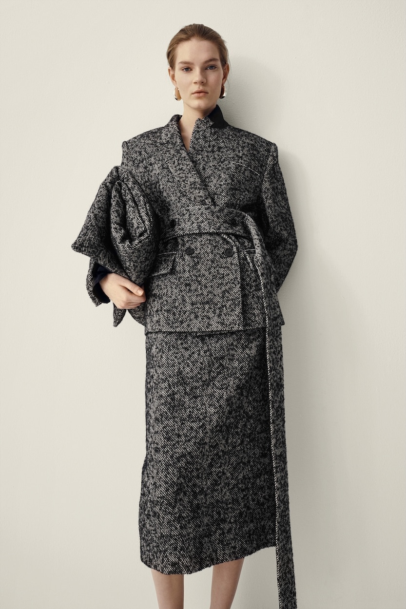 Key silhouettes include tailored coats with geometric lines, fluid dresses, and soft draped garments that fuse architectural structure with modern wearability. The colour palette features moody greys, rich burgundy, celery green, and Bauhaus-inspired light blue. Prints such as checks and chevrons reference Bauhaus design, adding subtle texture and refined detail. Each piece is crafted with attention to detail, emphasizing durability, fluidity, and a quiet sense of luxury.