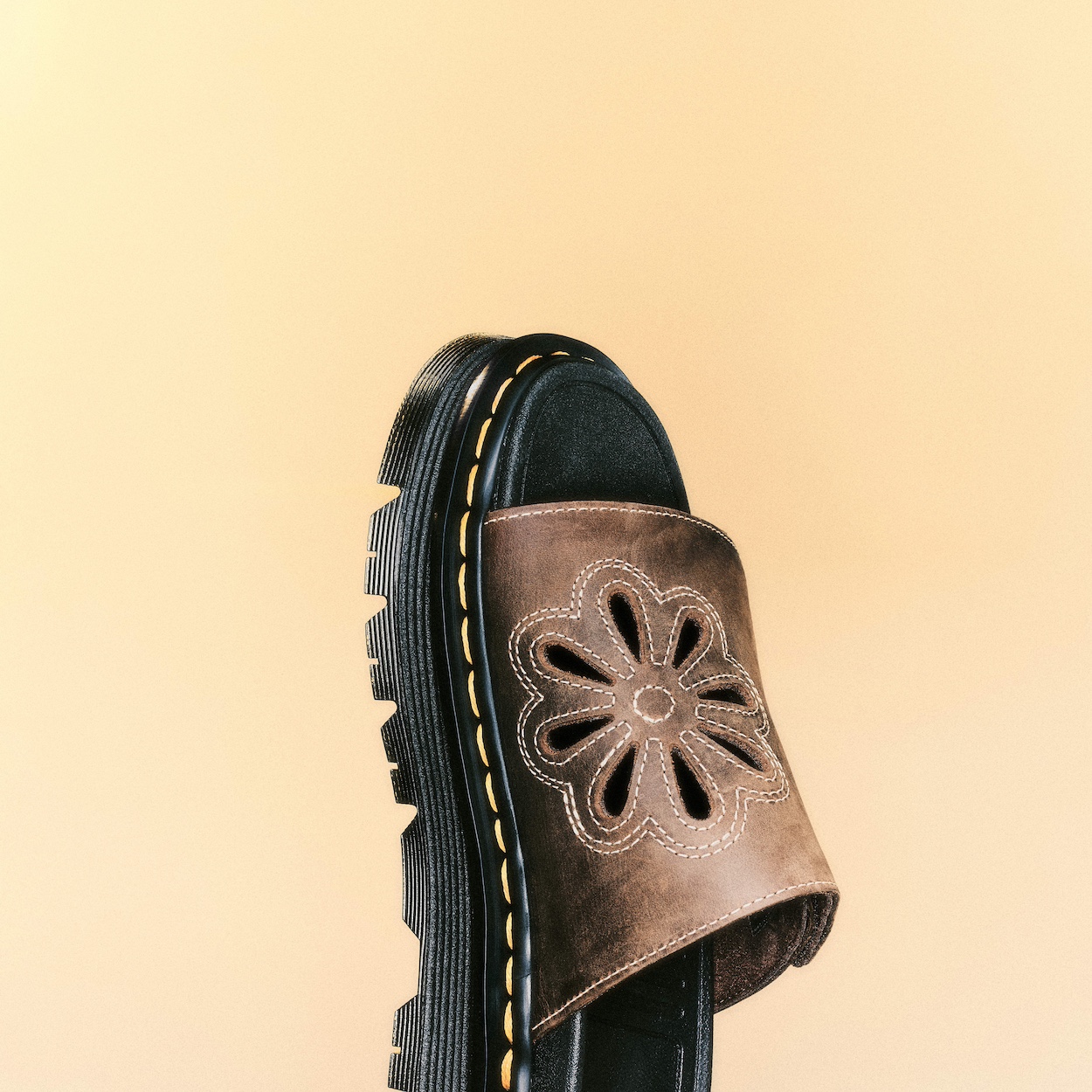 The collection features the Zebzag Dunnet Slide, which breathes new life into a floral motif from the DM’s archives by presenting it as an asymmetrical cut-out on heavy-duty Crazy Horse leather. This design is accented with subtle ecru stitching for a vintage touch, while the signature yellow welt stitch provides that unmistakable Dr. Martens contrast.