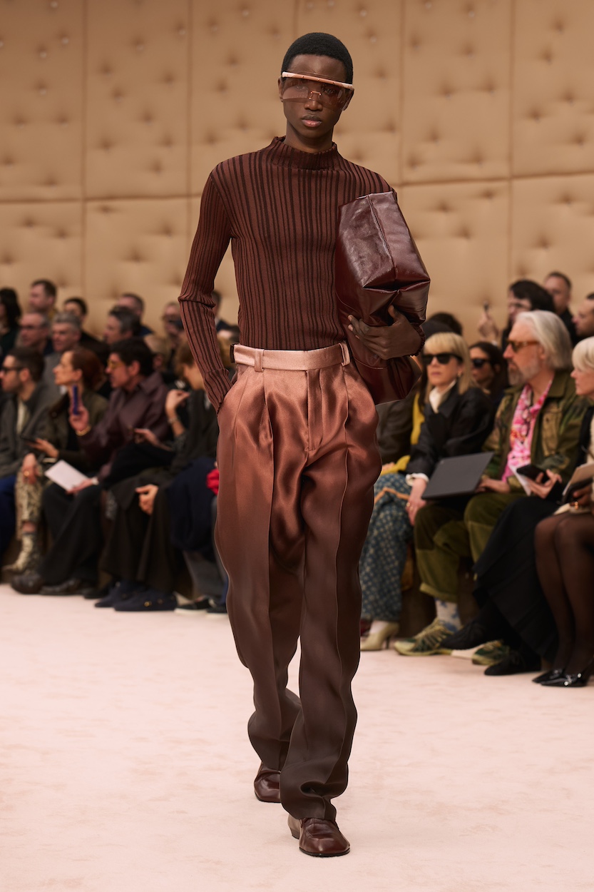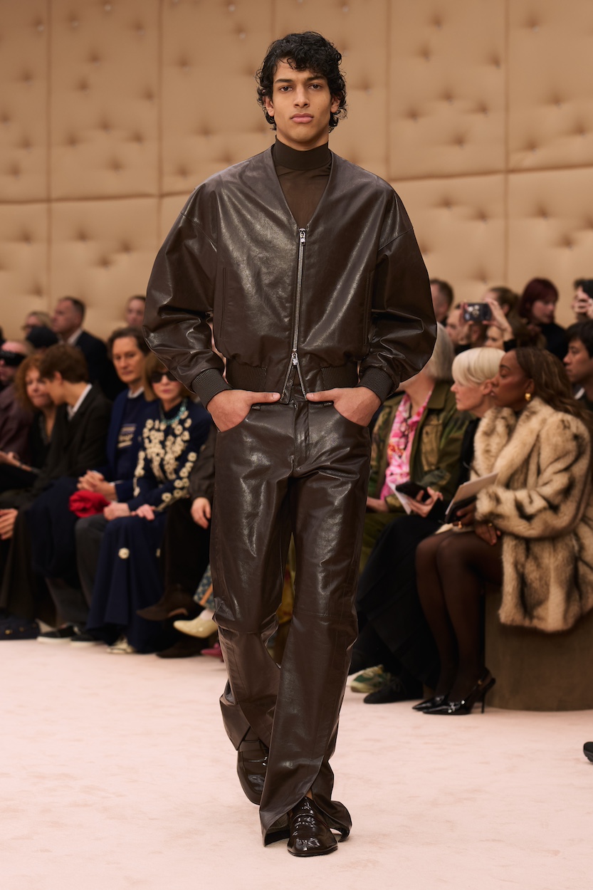 The Ferrari FW26 collection by Creative Director Rocco Iannone explores “skin” as a symbolic second layer that connects the individual to the world. Celebrating his tenth show, Iannone presents a vertical silhouette that balances nudity and coverage, utilizing materials ranging from delicate cupro to robust leather and padded duchesse silk.