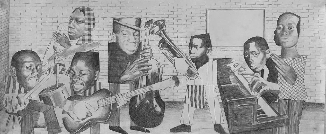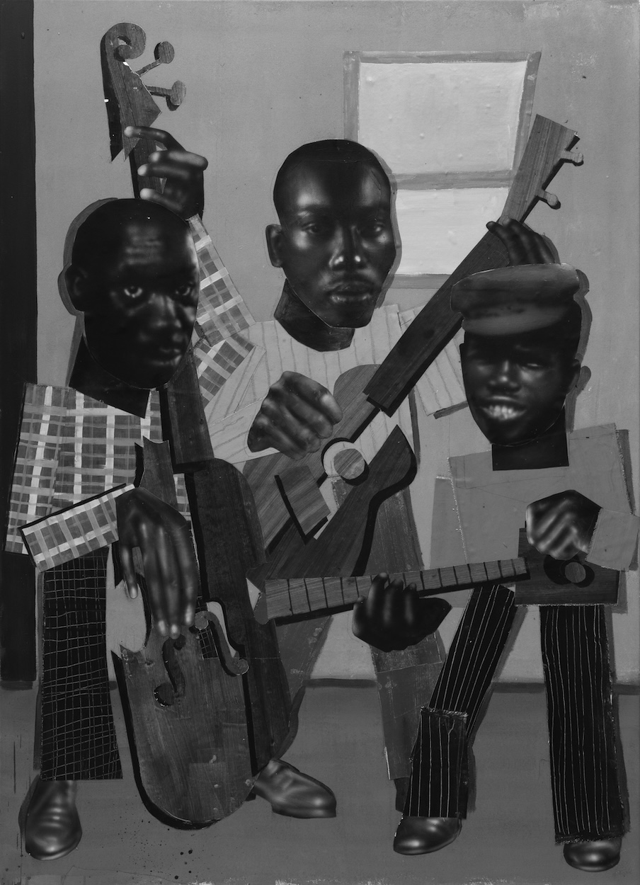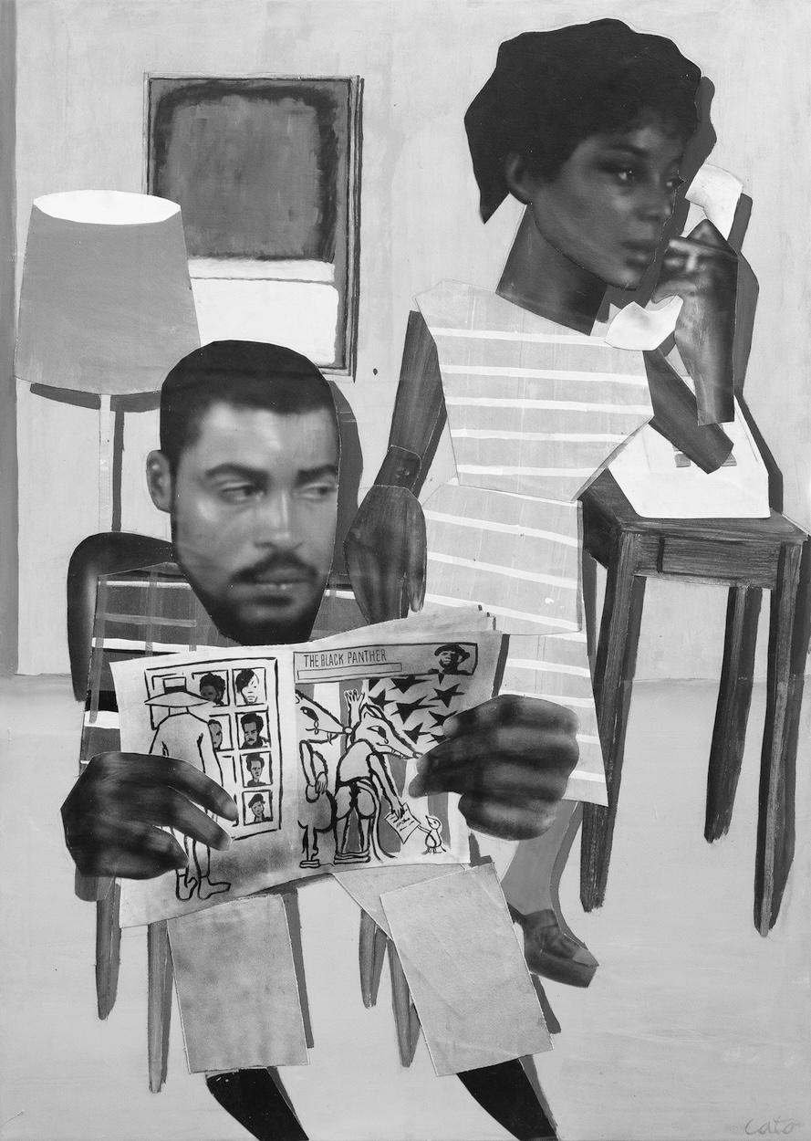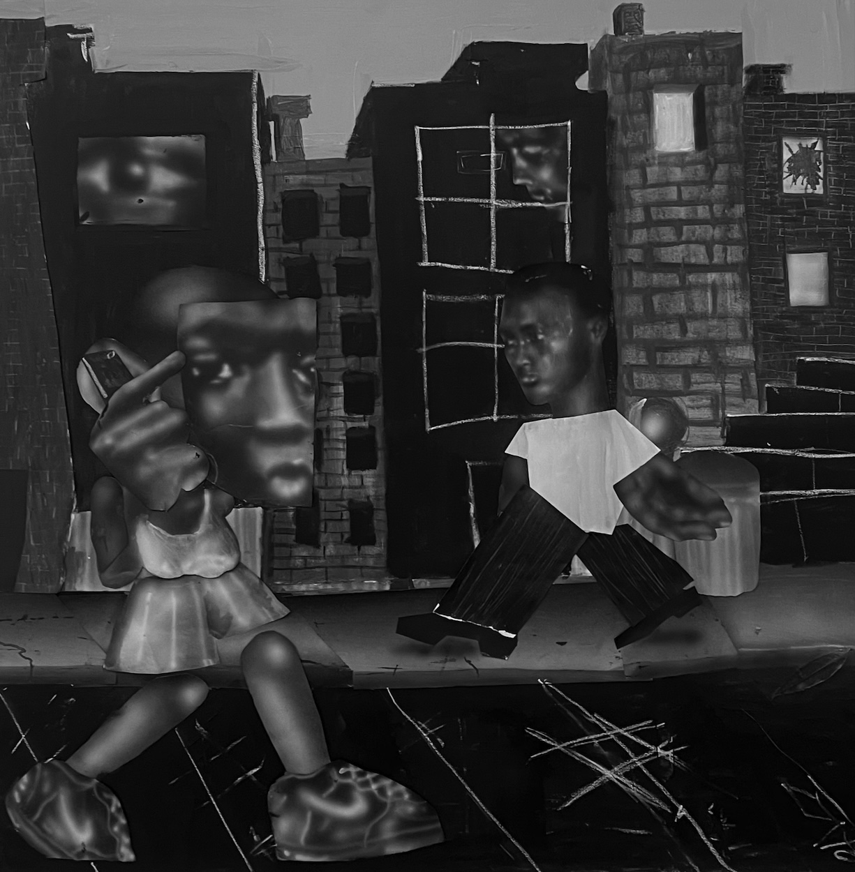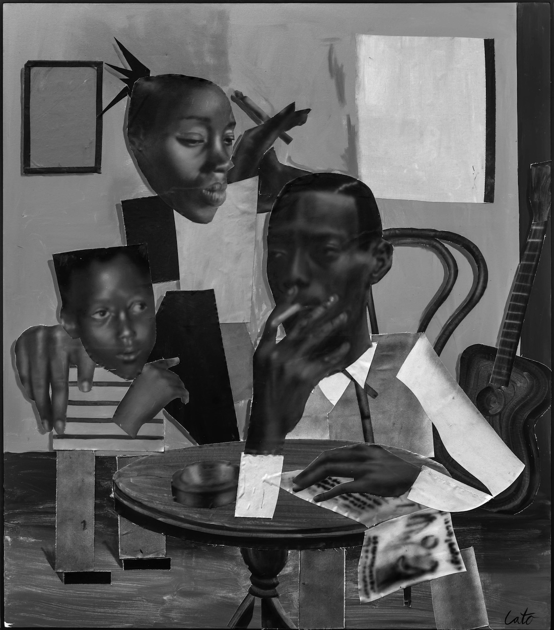 CATO                                   Cato is a contemporary painter known for his large-scale compositions that celebrate Black culture through a rich tapestry of jazz, street life, and intimate interiors. His works evoke the spirit of the Harlem Renaissance, channeling its artistic and musical vibrancy while reinterpreting it for today. Born into a family of artists, writers, and cultural historians, Cato’s deep connection to aesthetics translates into his painting process. His affinity for music also channels into his work, as rhythm and movement guide his brushstrokes. He employs a collage-like approach, layering figures with a photographic cut-up aesthetic, combining patterns and architectural elements to create dynamic, almost theatrical scenes. His color palette – often warm and muted, juxtaposed with elements of pop – enhances the nostalgic quality of his work, recalling postwar urban life. What sets Cato apart is his ability to merge historical reference with contemporary expression. His paintings are not just visual compositions. They are living archives of Black cultural memory, reimagined through a modern lens. By blending abstraction with figuration, Color Field painting with photographic collage, and brushstroke with airbrush, he creates a space where past and present coexist, offering a poetic homage to resilience, joy, and artistic legacy – one that is truly one of a kind.