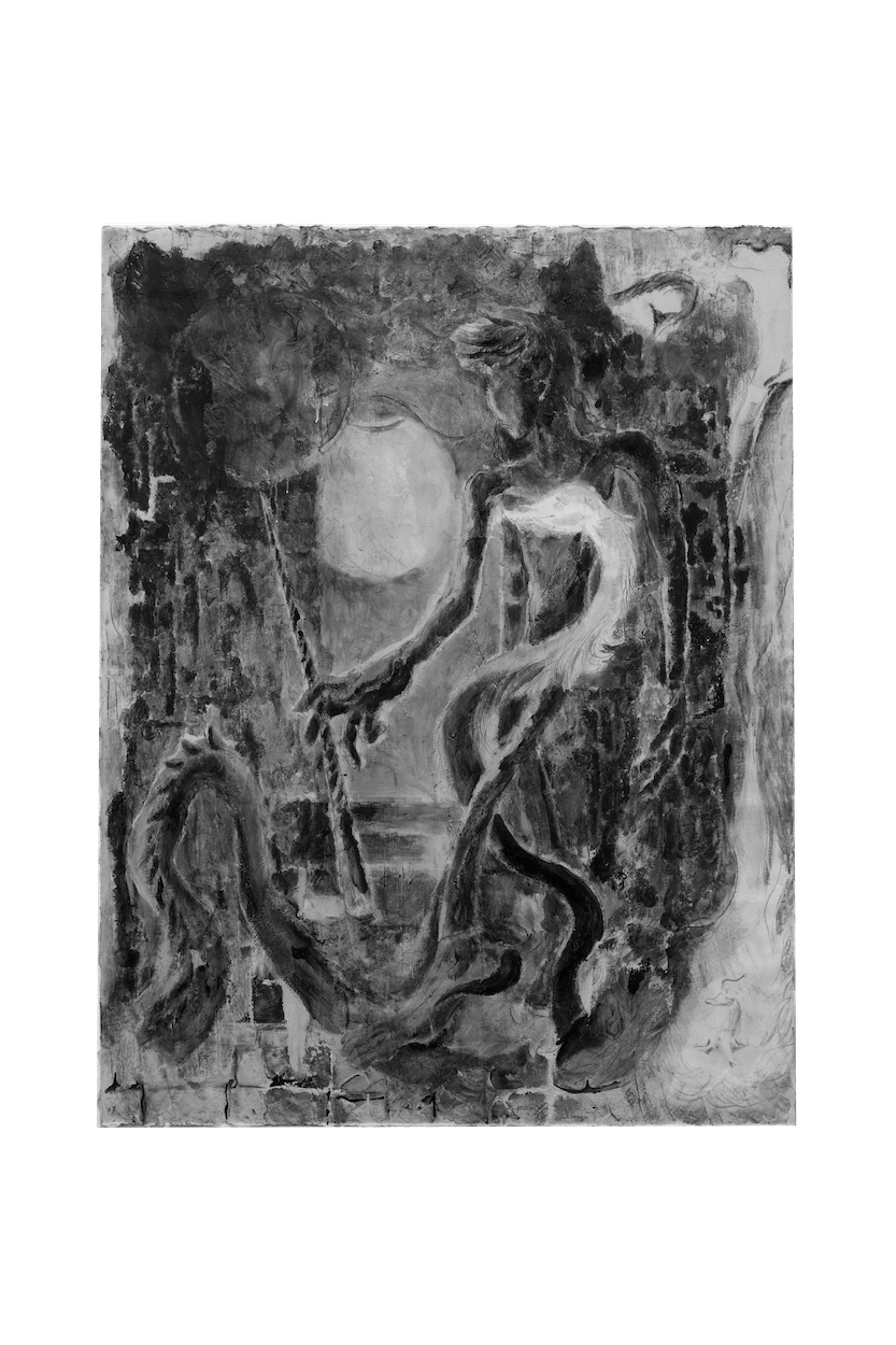 Emi Mizukami, born in Tokyo in 1992, is a Japanese artist renowned for her intricate paintings that intertwine mythological motifs with contemporary narratives. A graduate of Tama Art University with a BFA in Oil Painting (2017), she employs a distinctive mixed-media technique, layering acrylic paint, charcoal pencil, pastel, sand paste, and desert sand on linen panels to build textured surfaces. This method creates a mesmerizing interplay between visible and concealed elements, imbuing her works with a dreamlike, psychedelic quality. In her solo show, Million Bubbles, at Ehrlich Steinberg Gallery in Los Angeles (2024), Mizukami presented Out of the House and Into the Woods, a small, semi-abstract painting in shades of dark and lighter green. The work depicts a nightscape that feels like a fragment of a dream or memory. Framed by trees, a two-story mansion looms in the background, while in the middle ground, two animal figures, possibly horses, occupy a small, rectangular area. The composition morphs into a trippy, otherworldly aesthetic, blending surreal beauty with her signature textured depth.