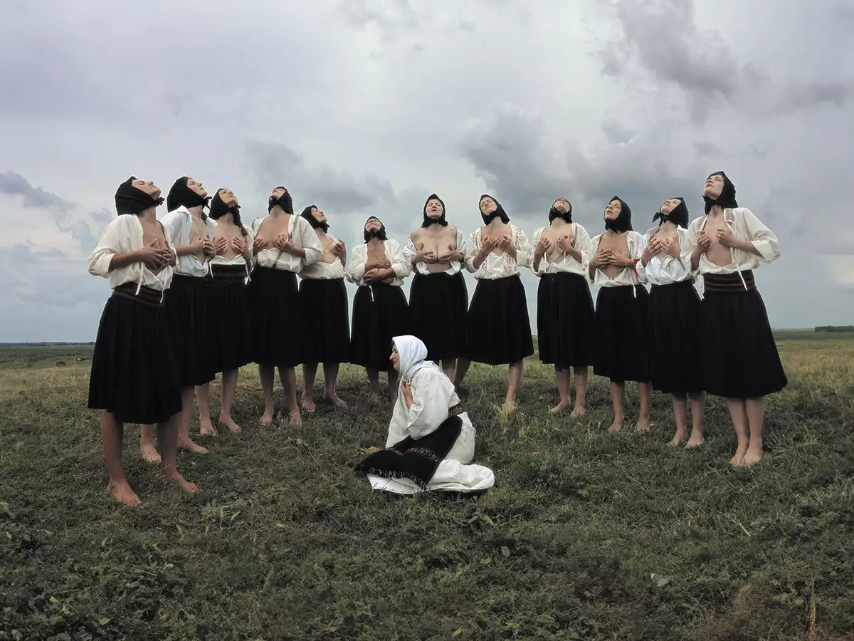 Women beat their chests and massage their breasts in lamentation, while a living naked body lies entwined with a skeleton: drawing on the folklore of Abramović’s native Balkans, the exhibition weaves together filmic and sculptural installations with live performance to explore eroticism as an offering that binds life and death, the self and the cosmos. It highlights the artist’s performances not merely as acts of personal endurance, but as imagined rituals that reposition the erotic body as carrier of spiritual, political and ecological meaning.